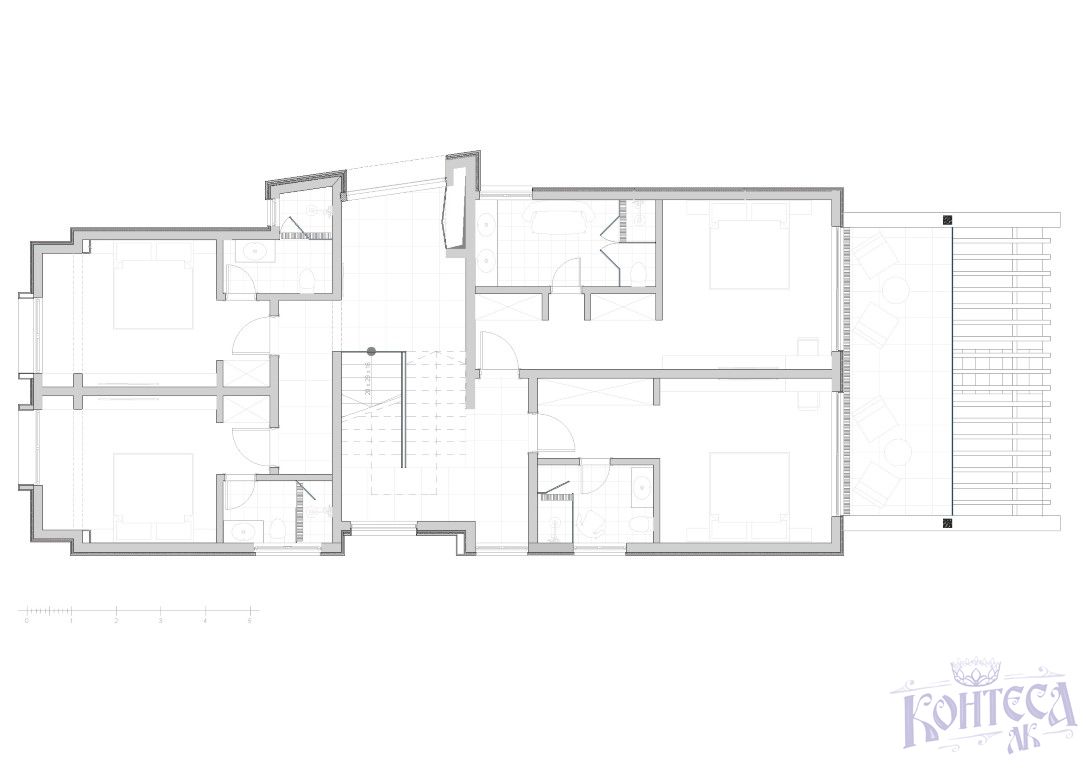 Первый этаж (158,13m2):Зона отдыха, балкон, лестница, прихожая, гостевая спальня I, ванная комната I, гостевая комната II, ванная комната II, ванная комната, главная спальня I, главная спальня II, ванная комната, терраса;