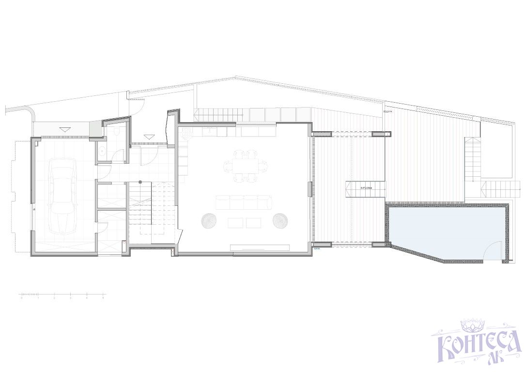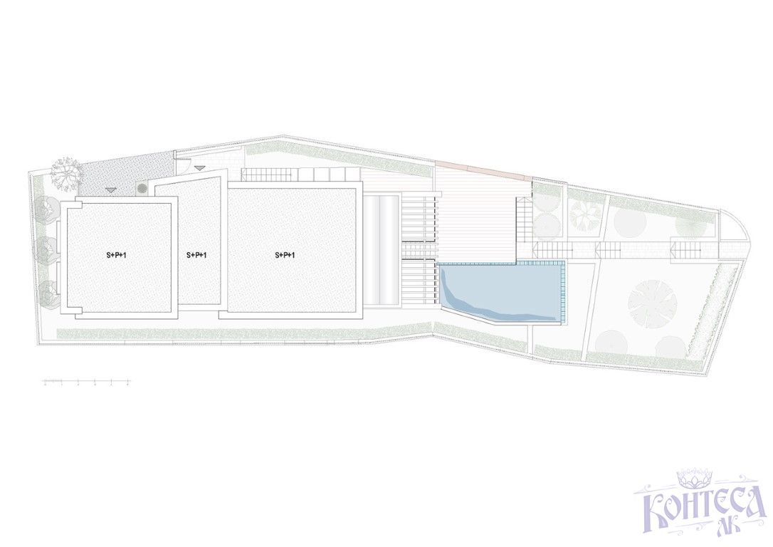 Цокольный этаж (163,42 м2):Прихожая, лестница, кухня, столовая, гостиная, прихожая, туалет, кладовка, гараж, подсобное помещение,кладовая, терраса, бассейн на уровне первого этажа;