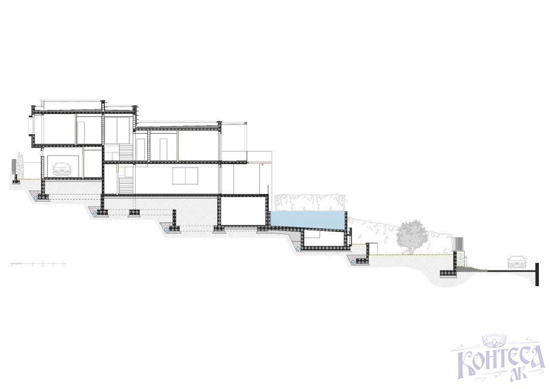 Подвал (49,78 м2):Кладовая, подсобное помещение, резервуар для рекуперации, машинное отделение бассейна в бассейне;