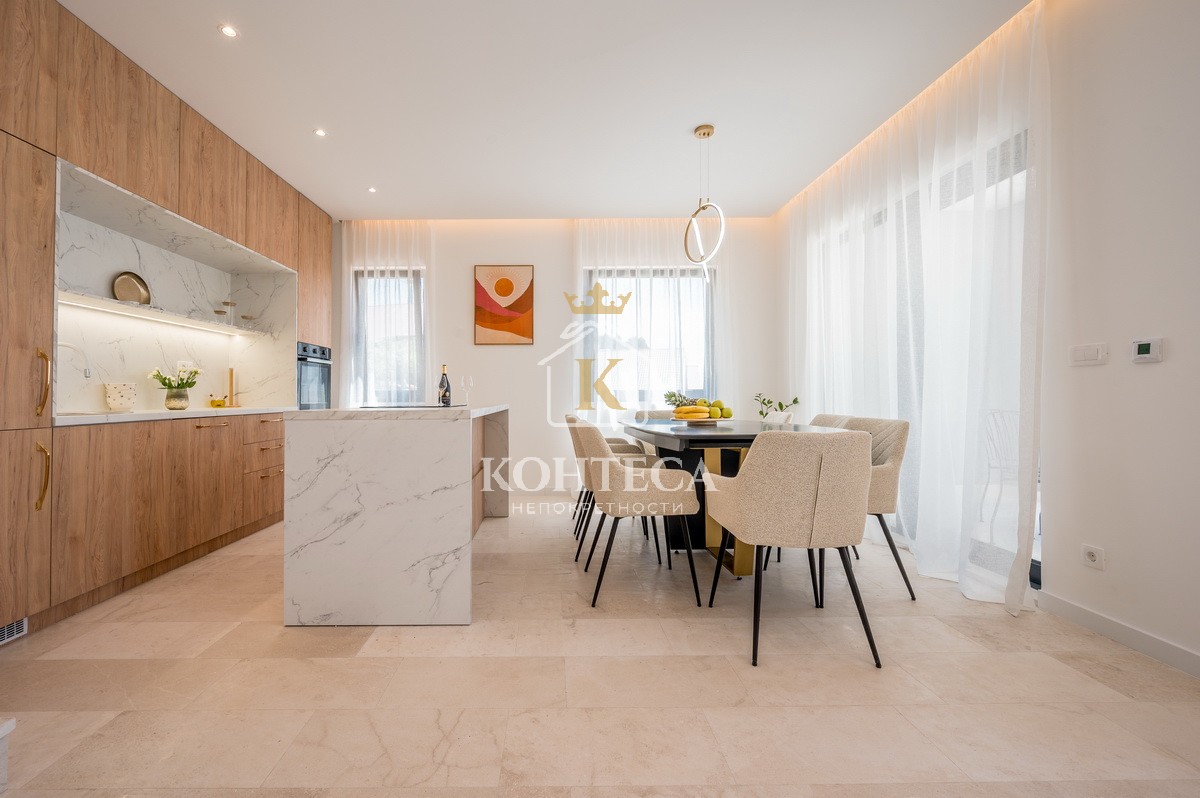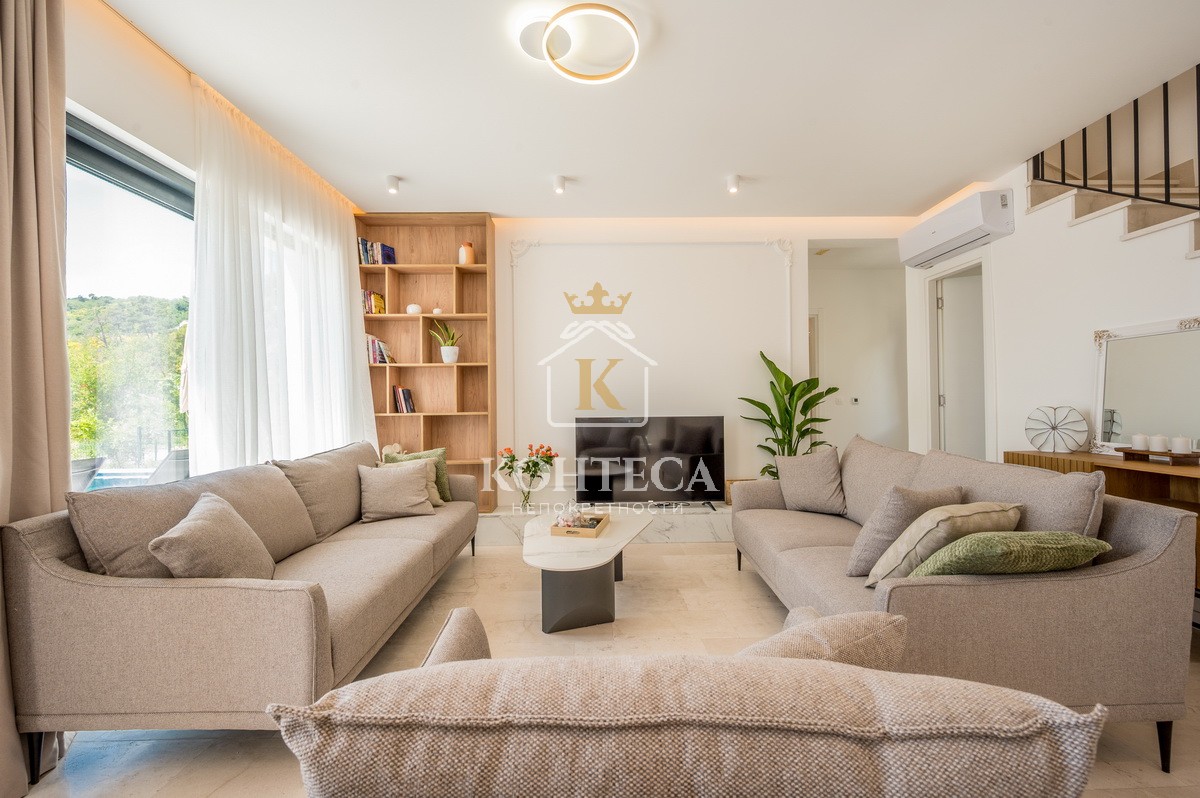 Вилла состоит из 4 спален с террасами, каждая из которых имеет вид на море, 4 ванных комнат, кухни, столовой, кладовой, большой гостиной с выходом на террасу с переливным бассейном и захватывающим видом на Тиватский залив. Также имеется гараж на 2 парковочных места и двор.